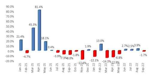 U.S. Monthly Golf Rounds Played Monthly Comps: 2021-September 2022